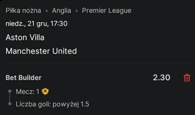 | Aston Villa + powyżej 1.5 gola | 2.30 – 2.40 | Aston Villa jest drużyną silniejszą jakościowo, rzadko przegrywa z United. United ma niestabilną defensywę i może stracić 2 bramki. Villa regularnie kreuje wiele sytuacji i ma potencjał ofensywny, by strzelić minimum 2 gole szczególnie na swoim stadionie. |