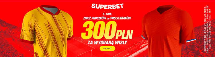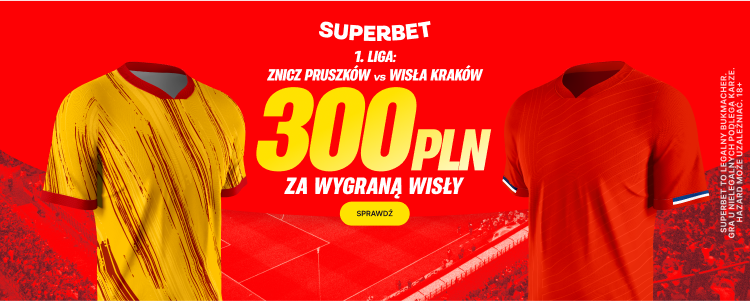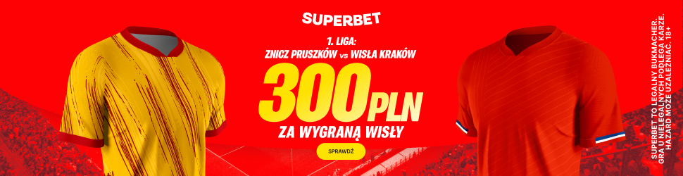 Postaw pierwszy kupon singiel na zwycięstwo Wisły Kraków w meczu ze Zniczem Pruszków, a jeśli Twój kupon okaże się wygrany, otrzymasz ekstra bonus 300 PLN.