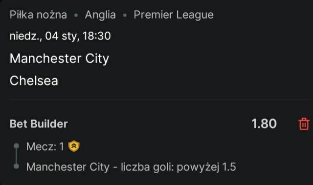 | City + powyżej 1.5 gola | 2.30 – 2.40 | City jest drużyną silniejszą jakościowo, rzadko przegrywa. Chelsea ma niestabilną defensywę i może stracić 2 bramki. City regularnie kreuje wiele sytuacji i ma potencjał ofensywny, by strzelić minimum 2 gole szczególnie na swoim stadionie. |