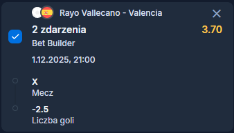 Biorąc pod uwagę defensywne nastawienie Rayo u siebie oraz fakt, że Valencia w meczach wyjazdowych jest ostrożna, typowanie małej liczby bramek jest najbezpieczniejsze i najlepiej uzasadnione.