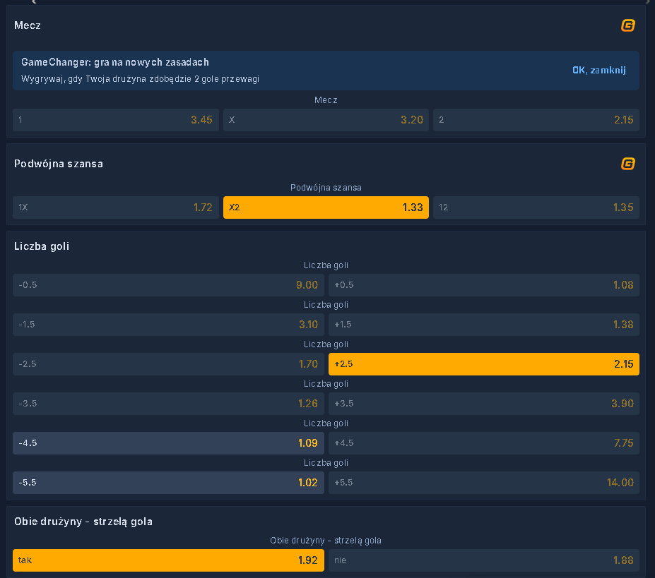 - Powyżej 2.5 gola w meczu: Mimo zaciętej walki w środku pola, potencjał ofensywny obu drużyn jest zbyt duży, by mecz zakończył się niskim wynikiem.