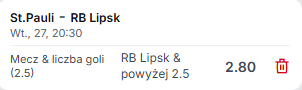 Zwycięstwo RB Lipsk & powyżej 2.5 gola w meczu2.80RB Leipzig dysponuje znacznie silniejszą ofensywą niż St. Pauli i zazwyczaj kontroluje przebieg meczów wyjazdowych. Zespół zdobywa średnio ponad 2 gole na mecz, a St. Pauli czasem strzela, co zwiększa liczbę bramek w meczu. Historyczne wyniki Lipska pokazują, że ich wyjazdowe zwycięstwa często kończą się kilkoma golami (np. 3:0, 3:1).