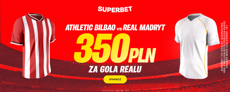 Cześć, fani La Liga i Królewskich! Mamy dla Was fantastyczną promocję, która podkręci emocje przy oglądaniu Realu Madryt! Superbet ogłosił specjalną ofertę, w której możecie odebrać AŻ 350 PLN EKSTRA za to, że Real Madryt strzeli choćby jednego gola w meczu ligowym przeciwko Athletic Bilbao!