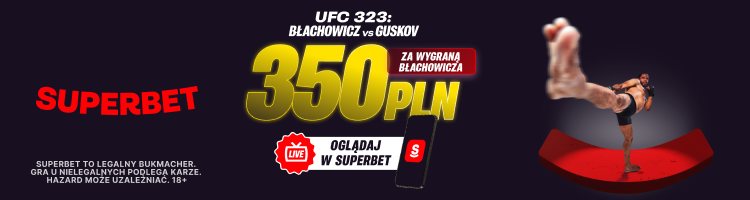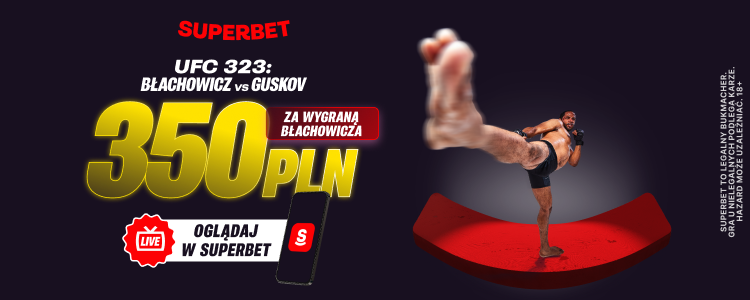 Cześć, fani MMA! Przed nami wielkie emocje, bo do oktagonu wchodzi Jan Błachowicz! Superbet przygotował dla Was fantastyczną promocję: możecie odebrać AŻ 350 PLN EKSTRA za to, że Jan Błachowicz zwycięży w walce z Bogdanem Guskovem na gali UFC 323!