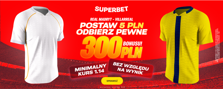 Chodzi o mecz Real Madryt – Villarreal, a Superbet daje gwarantowany Bonus 300 PLN! Tak, dobrze czytacie – GWARANTOWANE!