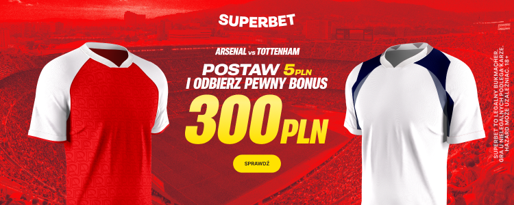 Cześć, fani Premier League! Mamy dla Was coś specjalnego na historyczne starcie Północnego Londynu! Superbet odpalił promocję, w której możesz zgarnąć GWARANTOWANE 300 PLN EKSTRA za postawienie pierwszego zakładu na mecz Arsenal – Tottenham. Co najlepsze – bonus jest Twój bez względu na wynik kuponu!