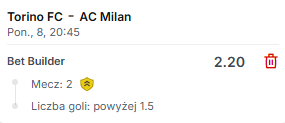 | AC Milan + Milan powyżej 1.5 gola | 2.20 – 2.30 | AC Milan jest drużyną silniejszą jakościowo, rzadko przegrywa z Torino. Torino ma słabą defensywę i często traci 2+ bramki. Milan regularnie kreuje wiele sytuacji i ma potencjał ofensywny, by strzelić minimum 2 gole nawet na wyjeździe. |