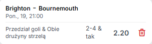 Przedział goli & Obie drużyny strzelą 2-4 & tak2.30 – 2.10 Brighton potrafi skutecznie atakować, szczególnie po powrocie Grossa, a Bournemouth bez Semenyo straciło część ofensywnej siły. Obie drużyny mogą zdobyć bramki, a spotkanie ma potencjał na co najmniej trzy gole.