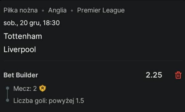 | Liverpool + powyżej 1.5 gola | 2.25 – 2.35 | Liverpooljest drużyną silniejszą jakościowo, rzadko przegrywa z Tottenhamem. Tottenham ma niestabilną defensywę i może stracić 2 bramki. Liverpool regularnie kreuje wiele sytuacji i ma potencjał ofensywny, by strzelić minimum 2 gole nawet na wyjeździe. |