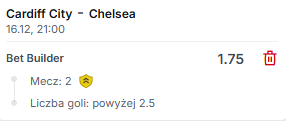 | Chelsea + powyżej 2.5 gola | 1.80 – 1.90 | Chelsea jest drużyną silniejszą jakościowo, rzadko przegrywa ze słabszymi drużynami. Cardiff ma słabą defensywę i często traci 2+ bramki. Chelsea regularnie kreuje wiele sytuacji i ma potencjał ofensywny, by zdobyć kilka bramek, a Cardiff może zadać cios z kontrataku. |