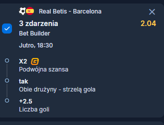 - Obie drużyny strzelą gola (BTTS) – kurs 1,40: Patrząc na ofensywny potencjał obu ekip, ten scenariusz wydaje się bardzo prawdopodobny. Zarówno Betis, jak i Barcelona, dysponują zawodnikami zdolnymi do pokonania defensywy rywala.